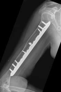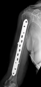 “Nonunion” is a condition where fractured bone ends fail to heal. The period of time that elapses from the day you break your bone and when that break has been determined to be a nonunion is variable dependent on what bone is broken, certain characteristics of the break, and how it is treated. Many fractures treated with an operation will heal within 2-3 months from the time of surgery, and when not healed by that time might be referred to as a “delayed union”. In a delayed union, some bone forming reaction may have occurred but bone has not yet fully healed. A delayed union may still heal without any further surgical intervention. If no healing reaction at all is present by 3 months a nonunion may have developed. Unfortunately, nonunions can occur even when you and your surgeon have done everything possible to get the fracture to heal. When a nonunion has developed, it may necessitate external bone stimulation, medications/supplementation, and/or additional surgical procedures including hardware revision, bone grafting, or a combination of the two. When a nonunion has developed, a consultation should be made with an orthopaedic fracture specialist who is proficient in the treatment of nonunions.