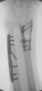 Distal radius malunion (left) treated with osteotomies, plating, and grafting (right)